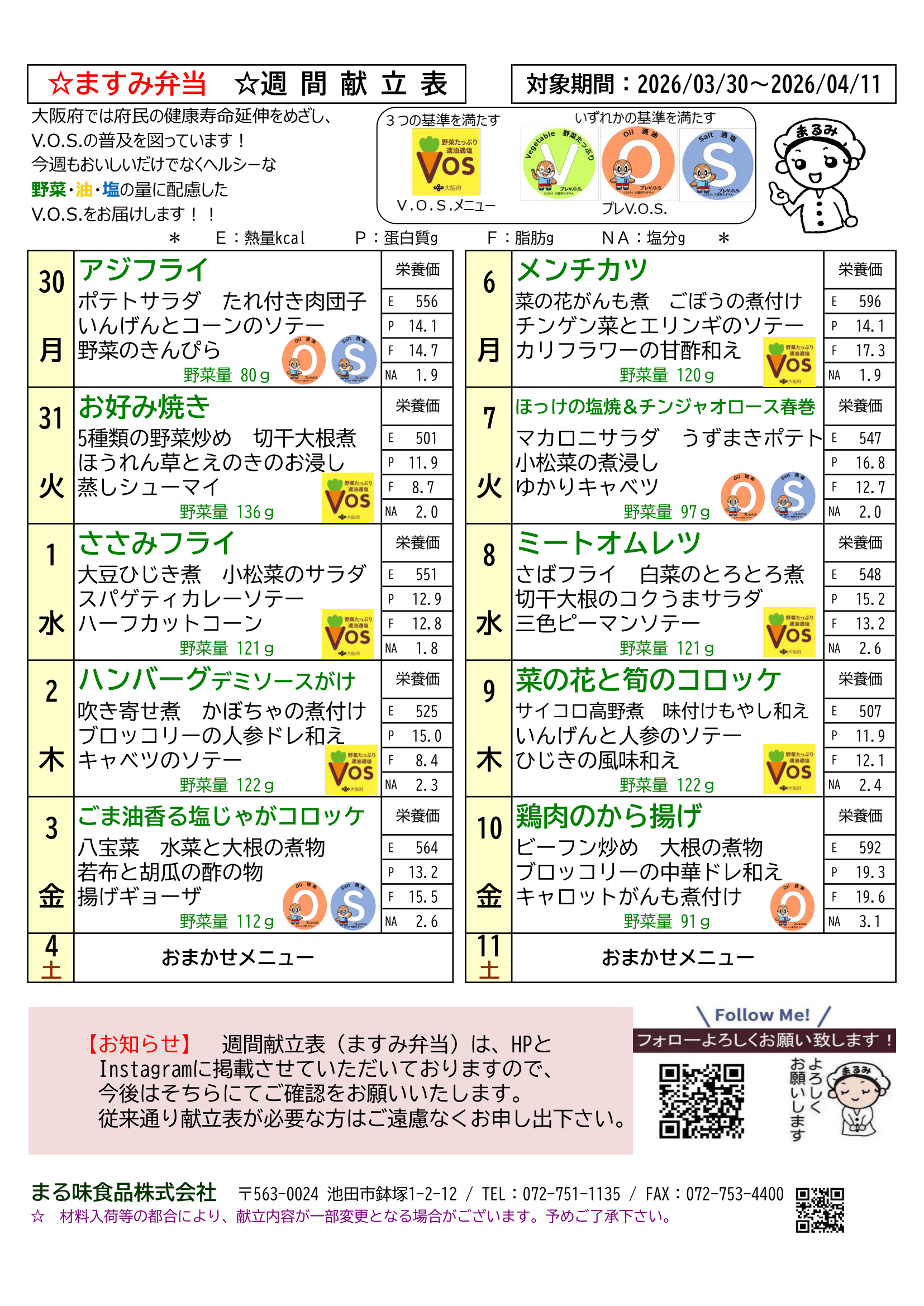 2026年3月30日~4月11日迄のますみ弁当週間献立表