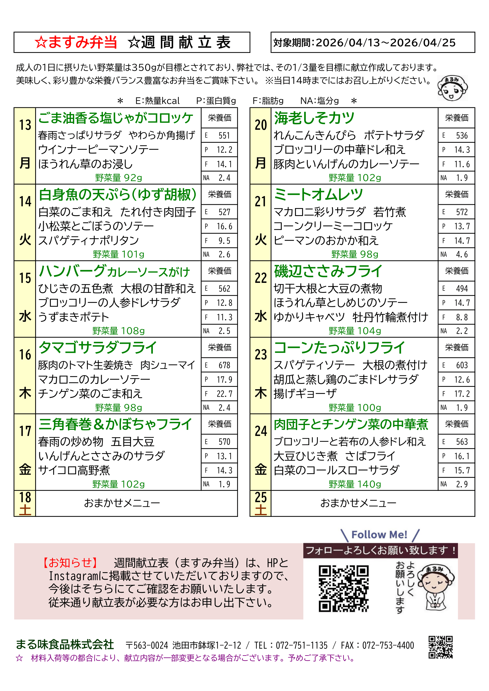 2026年4月13日~25日迄のますみ弁当週間献立表