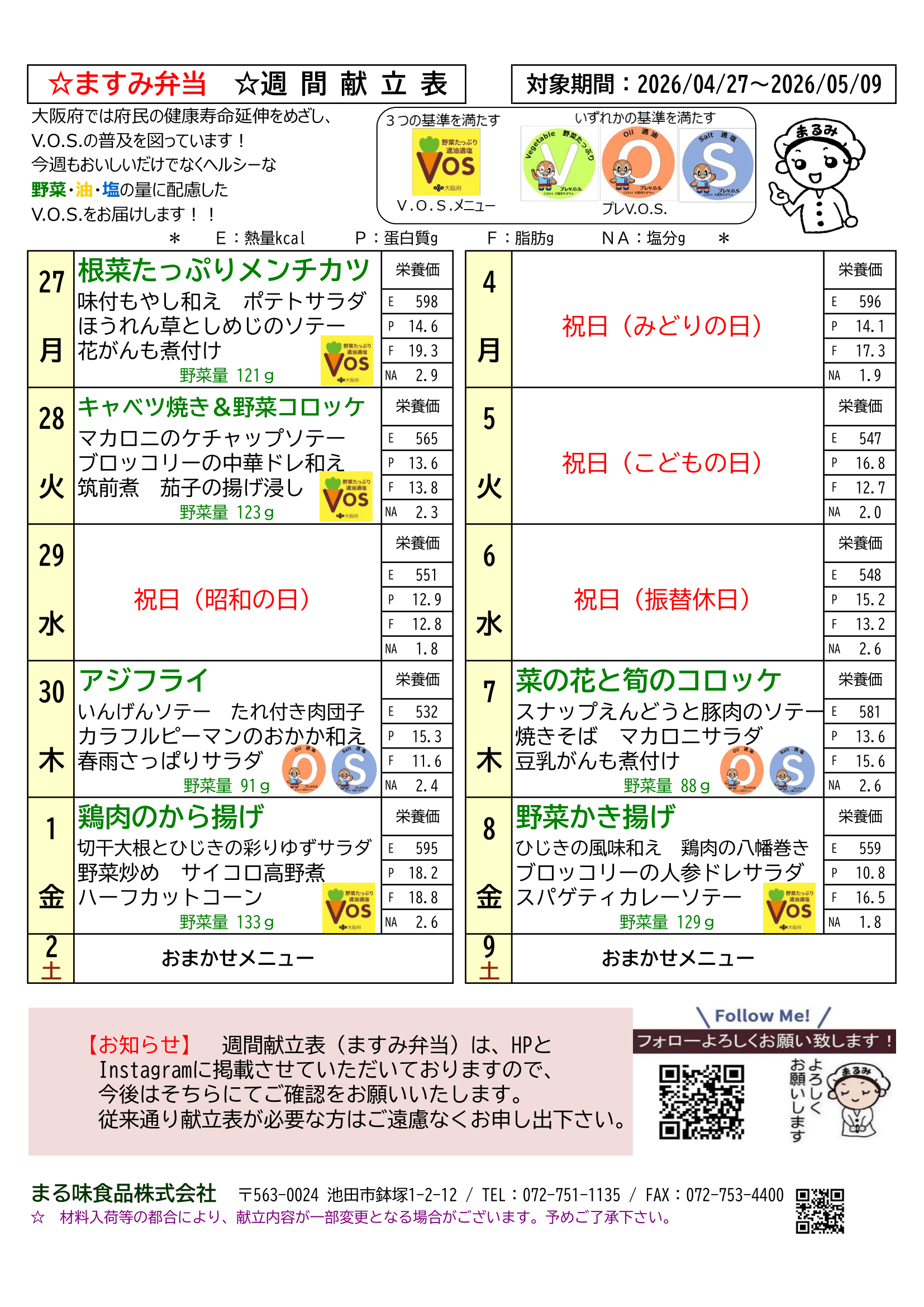 2026年4月27日~5月9日迄のますみ弁当週間献立表